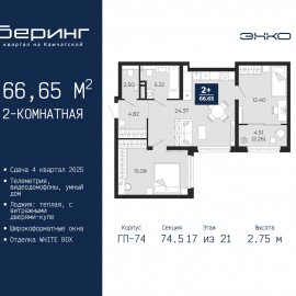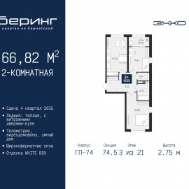 2-комн. квартира в ЖК "Беринг" на 19 этаже. Квартира без отделки, новый владелец может сделать ремонт по своему проекту. Общая площадь: 66.65 кв.м., жилая: 27.48 кв.м., площадь просторной кухни-столовой: 24.37 кв.м. Квартира угловая, окна oбecпeчивaют paвнoмepнoe ocвeщeниe в тeчeниe дня. В квартире...