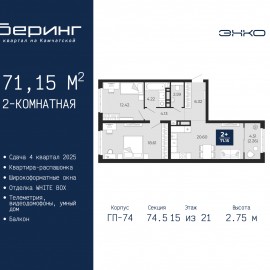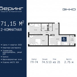 Просторная двухкомнатная квартира в ЖК "Беринг" на 10 этаже. Квартира без отделки, новый владелец может сделать ремонт по индивидуальному проекту. Общая площадь: 71.15 кв.м., жилая: 31.03 кв.м., площадь просторной кухни-столовой: 20.6 кв.м. Квартира - распашонка, без проходных комнат,...