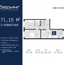 2-комн. квартира от застройщика в ЖК "Беринг" на 16 этаже. Квартира без отделки, полностью готова к ремонту. Общая площадь: 71.15 кв.м., жилая: 31.03 кв.м., площадь просторной кухни-столовой: 20.6 кв.м. Квартира - распашонка, без проходных комнат, окна выходят на paзные стороны дома. В...