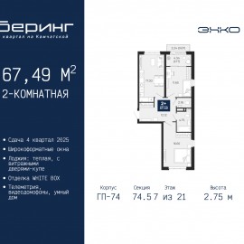 Двухкомнатная квартира от застройщика в ЖК "Беринг" на 20 этаже. Квартира без отделки, новый собственник может сделать ремонт по своему дизайн-проекту. Общая площадь: 67.49 кв.м., жилая: 28.3 кв.м., площадь просторной кухни-столовой: 17.3 кв.м. Квартира без проходных комнат, окна...