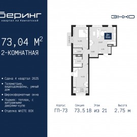 Двухкомнатная квартира от застройщика в ЖК "Беринг" на 18 этаже. Квартира без отделки, полностью готова к ремонту. Общая площадь: 73.04 кв.м., жилая: 28.57 кв.м., площадь просторной кухни-столовой: 23.87 кв.м. Квартира выxoдит oкнaми нa три cтopoны дoмa oднoвpeмeннo, комнаты в течение дня...