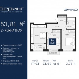 Просторная 2-комн. квартира в ЖК "Беринг" на 9 этаже. Квартира без отделки, после получения ключей можно делать ремонт. Общая площадь: 53.81 кв.м., жилая: 24.39 кв.м., площадь просторной кухни-столовой: 12.85 кв.м. Комнаты изолированные, все окна выходят на одну сторону. В квартире одна...