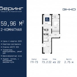 2-комн. квартира от застройщика в ЖК "Беринг" на 22 этаже. Квартира без отделки, после оформления собственности можно делать ремонт. Общая площадь: 59.96 кв.м., жилая: 25.01 кв.м., площадь просторной кухни-столовой: 15.21 кв.м. Квартира - распашонка, очень светлая, без проходных комнат,...