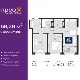 Просторная двухкомнатная квартира с предчистовой отделкой в ЖК "Прео" на 14 этаже. Общая площадь: 59.26 кв.м., жилая: 23.26 кв.м., площадь просторной кухни-столовой: 15.77 кв.м. Комнаты изолированные, все окна выходят на одну сторону. В квартире одна лоджия, один раздельный санузел....