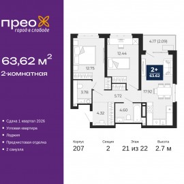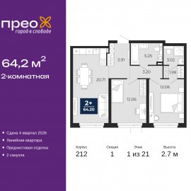 Просторная 2-комн. квартира с предчистовой отделкой в ЖК "Прео" на 21 этаже. Общая площадь: 63.62 кв.м., жилая: 25.19 кв.м., площадь просторной кухни-столовой: 17.92 кв.м. Угловая квартира, очень светлая, естественная вентиляция при открытии окон. В квартире одна лоджия, один совмещенный...