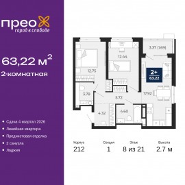 Просторная двухкомнатная квартира с предчистовой отделкой в ЖК "Прео" на 8 этаже. Общая площадь: 63.22 кв.м., жилая: 25.19 кв.м., площадь просторной кухни-столовой: 17.92 кв.м. Комнаты изолированные, все окна выходят на одну сторону. В квартире одна лоджия, один совмещенный и один...