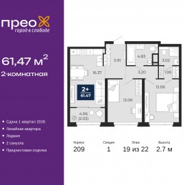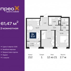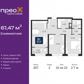 2-комн. квартира от застройщика с предчистовой отделкой в ЖК "Прео" на 19 этаже. Общая площадь: 61.47 кв.м., жилая: 24.12 кв.м., площадь просторной кухни-столовой: 16.37 кв.м. Комнаты изолированные, все окна выходят на одну сторону. В квартире одна лоджия, два совмещенных санузла. Высота...