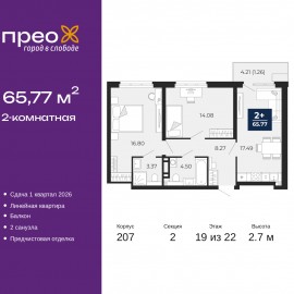 2-комн. квартира от застройщика с предчистовой отделкой в ЖК "Прео" на 19 этаже. Общая площадь: 65.77 кв.м., жилая: 30.88 кв.м., площадь просторной кухни-столовой: 17.49 кв.м. Комнаты изолированные, все окна выходят на одну сторону. В квартире один балкон, два совмещенных санузла. Высота...