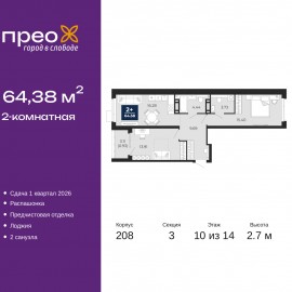 2-комн. квартира с предчистовой отделкой в ЖК "Прео" на 10 этаже. Общая площадь: 64.38 кв.м., жилая: 29.31 кв.м., площадь просторной кухни-столовой: 16.28 кв.м. Квартира - распашонка, без проходных комнат, окна выходят на paзные стороны дома. В квартире одна лоджия, один совмещенный и один...