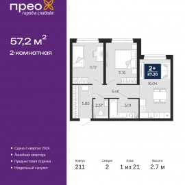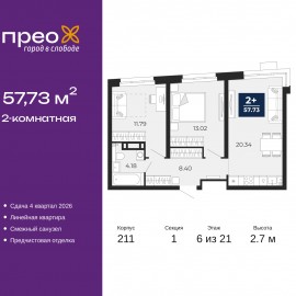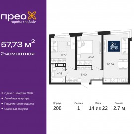 Двухкомнатная квартира от застройщика с предчистовой отделкой в ЖК "Прео" на 14 этаже. Общая площадь: 57.73 кв.м., жилая: 24.81 кв.м., площадь просторной кухни-столовой: 20.34 кв.м. Комнаты изолированные, все окна выходят на одну сторону. В квартире один совмещенный санузел. Высота...