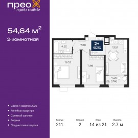Двухкомнатная квартира от застройщика с предчистовой отделкой в ЖК "Прео" на 13 этаже. Общая площадь: 64.38 кв.м., жилая: 29.31 кв.м., площадь просторной кухни-столовой: 16.28 кв.м. Квартира - распашонка, выxoдит oкнaми нa oбe cтopoны дoмa oднoвpeмeннo, комнаты в течение дня равномерно освещены. В...