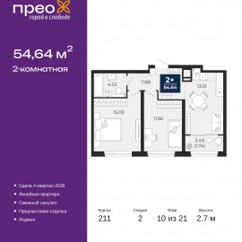Двухкомнатная квартира с предчистовой отделкой в ЖК "Прео" на 10 этаже. Общая площадь: 54.64 кв.м., жилая: 26.99 кв.м., площадь просторной кухни-столовой: 13.51 кв.м. Комнаты изолированные, все окна выходят на одну сторону. В квартире одна лоджия, один совмещенный санузел. Высота...