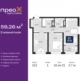 Двухкомнатная квартира от застройщика с предчистовой отделкой в ЖК "Прео" на 10 этаже. Общая площадь: 59.26 кв.м., жилая: 23.26 кв.м., площадь просторной кухни-столовой: 15.77 кв.м. Комнаты изолированные, все окна выходят на одну сторону. В квартире одна лоджия, один раздельный санузел....