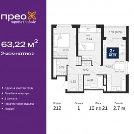 2-комн. квартира от застройщика с предчистовой отделкой в ЖК "Прео" на 16 этаже. Общая площадь: 63.22 кв.м., жилая: 25.19 кв.м., площадь просторной кухни-столовой: 17.92 кв.м. Комнаты изолированные, все окна выходят на одну сторону. В квартире одна лоджия, один совмещенный и один...