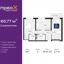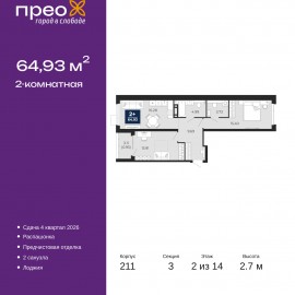 2-комн. квартира от застройщика с предчистовой отделкой в ЖК "Прео" на 15 этаже. Общая площадь: 65.77 кв.м., жилая: 30.88 кв.м., площадь просторной кухни-столовой: 17.49 кв.м. Комнаты изолированные, все окна выходят на одну сторону. В квартире один балкон, два совмещенных санузла. Высота...