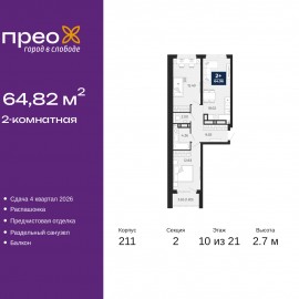 Двухкомнатная квартира от застройщика с предчистовой отделкой в ЖК "Прео" на 10 этаже. Общая площадь: 64.82 кв.м., жилая: 28.32 кв.м., площадь просторной кухни-столовой: 18.62 кв.м. Квартира - распашонка, без проходных комнат, окна выходят на paзные стороны дома. В квартире один балкон,...