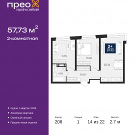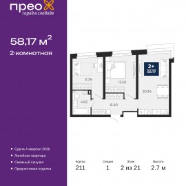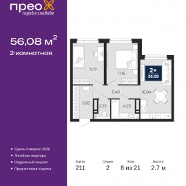 Успейте оформить бронирование по этой цене, период предложения ограничен! Стоимость квартиры указана со скидкой, ваша экономия составит 920, 000 руб. Информация по телефону, мы вам все подробно расскажем. Просторная 2-комн. квартира с предчистовой отделкой в ЖК "Прео" на 13...