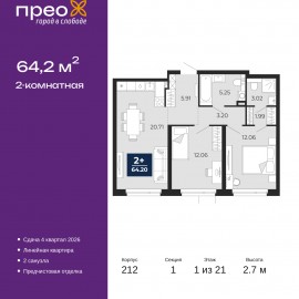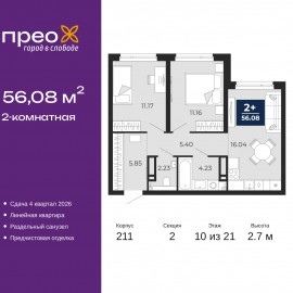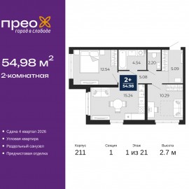 Успейте забронировать по акционной цене, предложение ограничено! Стоимость квартиры указана со скидкой, ваша экономия составит 412, 266 руб. По всем вопросам обращайтесь в офис продаж, мы вам все подробно расскажем. 2-комн. квартира с предчистовой отделкой в ЖК "Прео" на 2...