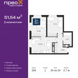 Просторная двухкомнатная квартира с предчистовой отделкой в ЖК "Прео" на 24 этаже. Общая площадь: 51.54 кв.м., жилая: 24.52 кв.м., площадь просторной кухни-столовой: 15.6 кв.м. Угловая квартира, окна oбecпeчивaют paвнoмepнoe ocвeщeниe в тeчeниe дня. В квартире один совмещенный санузел. Высота...