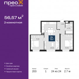 Просторная двухкомнатная квартира с предчистовой отделкой в ЖК "Прео" на 24 этаже. Общая площадь: 56.57 кв.м., жилая: 21.96 кв.м., площадь просторной кухни-столовой: 25.02 кв.м. Комнаты изолированные, все окна выходят на одну сторону. В квартире один совмещенный санузел. Высота...