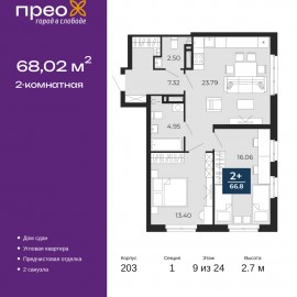 Успейте забронировать на этих условиях, срок акции ограничен! Стоимость квартиры указана со скидкой, ваша экономия составит 922, 000 руб. Звоните, мы вам все подробно расскажем. 2-комн. квартира с предчистовой отделкой в ЖК "Прео" на 9 этаже. Общая площадь: 68.02 кв.м., жилая: 29.46...
