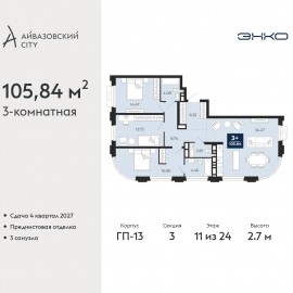 3-комн. квартира с предчистовой отделкой в ЖК "Айвазовский City" на 11 этаже. Общая площадь: 105.84 кв.м., жилая: 45.16 кв.м., площадь просторной кухни-столовой: 34.27 кв.м. Квартира без проходных комнат, окна выходят нa три cтopoны дома. В квартире два совмещенных и один раздельный санузел....