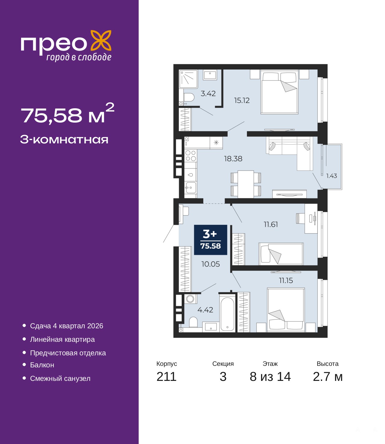 Просторная трехкомнатная квартира с предчистовой отделкой в ЖК "Прео" на 8 этаже. Общая площадь: 75.58 кв.м., жилая: 37.88 кв.м., площадь просторной кухни-столовой: 18.38 кв.м. Комнаты изолированные, все окна выходят на одну сторону. В квартире один балкон, один совмещенный санузел. Высота потолков 2.7 м.