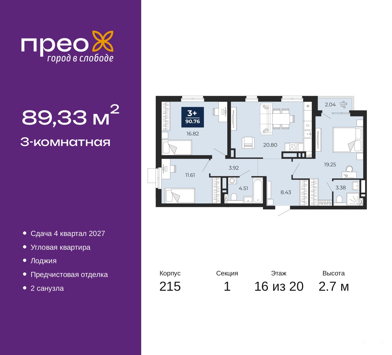 Просторная 3-комн. квартира с предчистовой отделкой в ЖК "Прео" на 16 этаже. Общая площадь: 89.33 кв.м., жилая: 47.68 кв.м., площадь просторной кухни-столовой: 20.8 кв.м. Угловая квартира, идеально подойдет любителям тишины и панорамных видов. В квартире одна лоджия, два совмещенных санузла. Высота потолков 2.7 м.