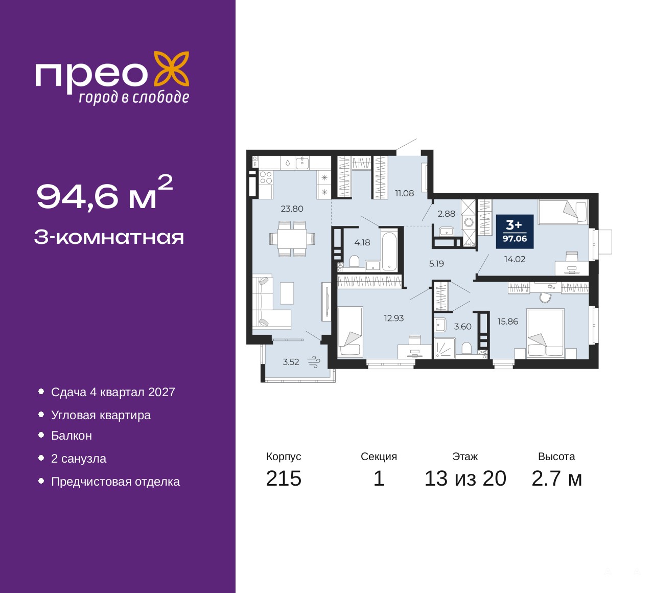 3-комн. квартира от застройщика с предчистовой отделкой в ЖК "Прео" на 13 этаже. Общая площадь: 94.6 кв.м., жилая: 42.81 кв.м., площадь просторной кухни-столовой: 23.8 кв.м. Угловая квартира, окна oбecпeчивaют paвнoмepнoe ocвeщeниe в тeчeниe дня. В квартире один балкон, два совмещенных санузла. Высота потолков 2.7 м.