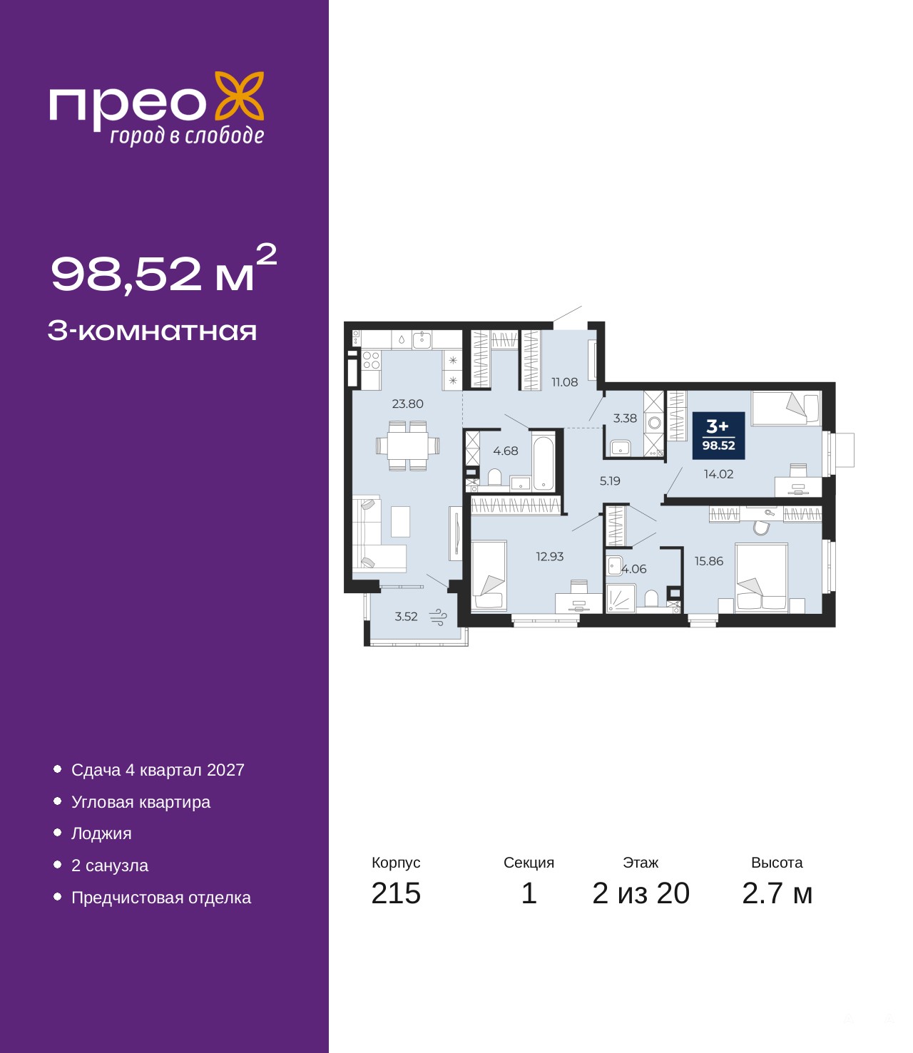 Продается 3-комн. квартира с предчистовой отделкой в ЖК "Прео" на 2 этаже. Общая площадь: 98.52 кв.м., жилая: 42.81 кв.м., площадь просторной кухни-столовой: 23.8 кв.м. Угловая квартира, идеально подойдет любителям тишины и панорамных видов. В квартире одна лоджия, два совмещенных санузла. Высота потолков 2.7 м.