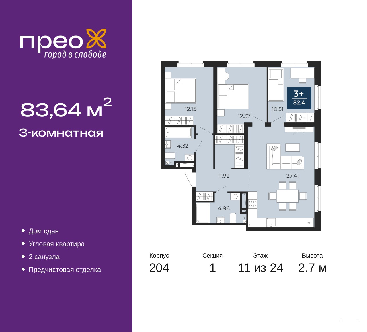 3-комн. квартира от застройщика с предчистовой отделкой в ЖК "Прео" на 11 этаже. Общая площадь: 83.64 кв.м., жилая: 35.03 кв.м., площадь просторной кухни-столовой: 27.41 кв.м. Квартира угловая, идеально подойдет любителям тишины и панорамных видов. В квартире два совмещенных санузла. Высота потолков 2.7 м.