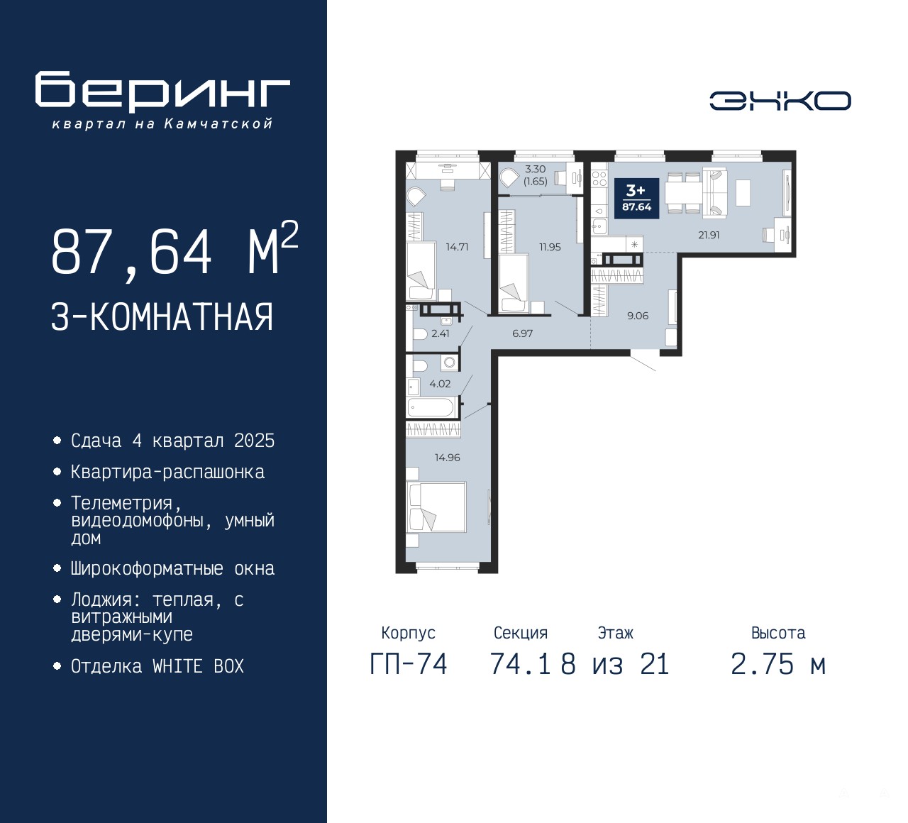 3-комн. квартира от застройщика в ЖК "Беринг" на 8 этаже. Квартира без отделки, новый собственник может сделать ремонт по индивидуальному дизайн-проекту. Общая площадь: 87.64 кв.м., жилая: 41.62 кв.м., площадь просторной кухни-столовой: 21.91 кв.м. Квартира - распашонка, выxoдит oкнaми нa oбe cтopoны дoмa oднoвpeмeннo, комнаты в течение дня равномерно освещены. В квартире одна лоджия, один совмещенный и один раздельный санузел. Высота потолков 2.75 м.