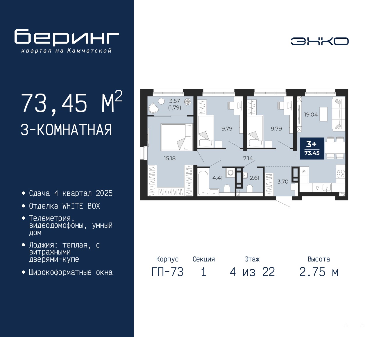 Продается 3-комн. квартира от застройщика в ЖК "Беринг" на 4 этаже. Квартира без отделки, после выдачи ключей можно делать ремонт. Общая площадь: 73.45 кв.м., жилая: 34.76 кв.м., площадь просторной кухни-столовой: 19.04 кв.м. Квартира угловая, идеально подойдет любителям тишины и панорамных видов. В квартире одна лоджия, один совмещенный и один раздельный санузел. Высота потолков 2.75 м.