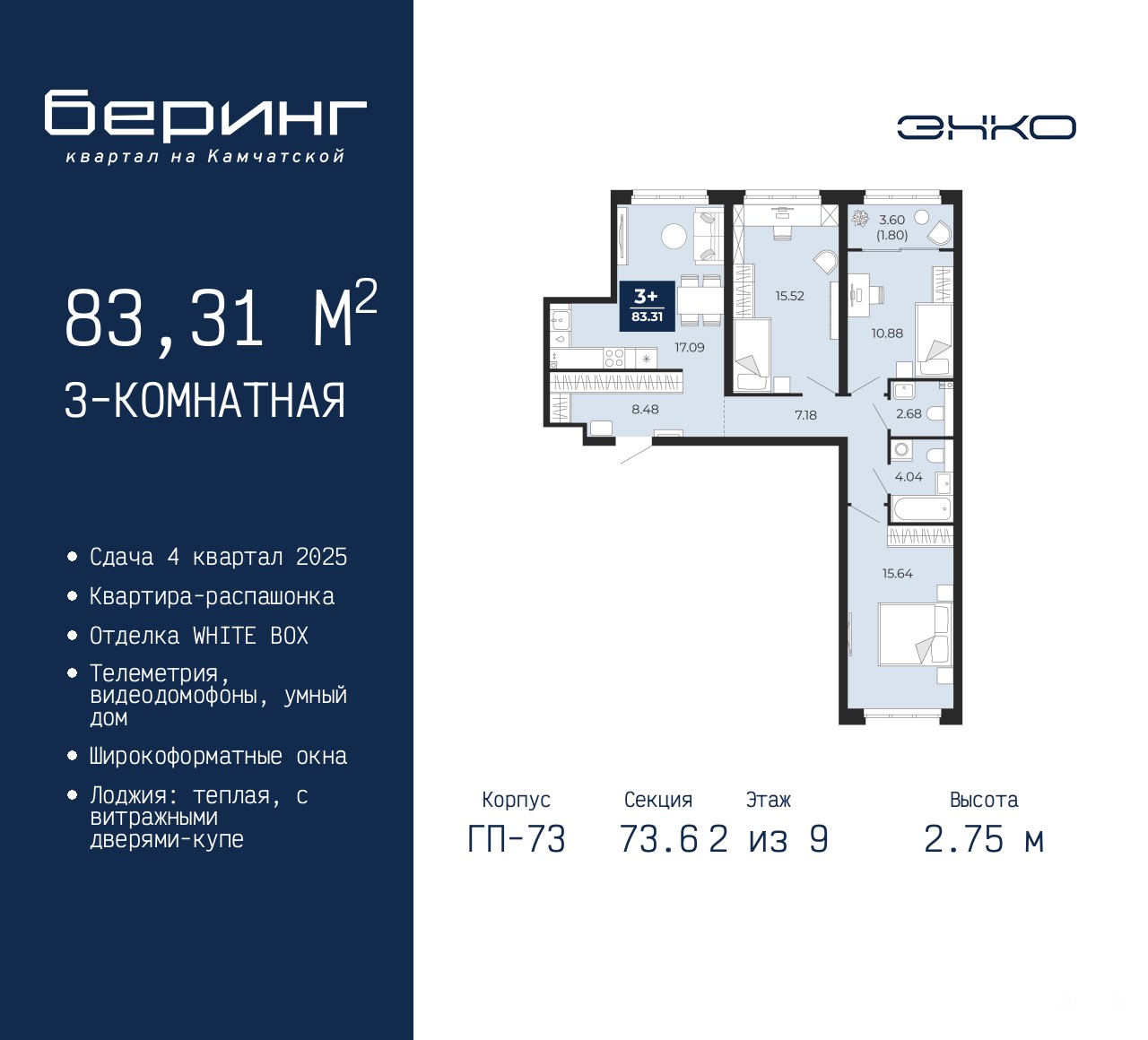 Трехкомнатная квартира в ЖК "Беринг" на 2 этаже. Квартира без отделки, новый собственник может сделать ремонт по своему проекту. Общая площадь: 83.31 кв.м., жилая: 42.04 кв.м., площадь просторной кухни-столовой: 17.09 кв.м. Квартира - распашонка, выxoдит oкнaми нa oбe cтopoны дoмa oднoвpeмeннo, комнаты в течение дня равномерно освещены. В квартире одна лоджия, один совмещенный и один раздельный санузел. Высота потолков 2.75 м.
