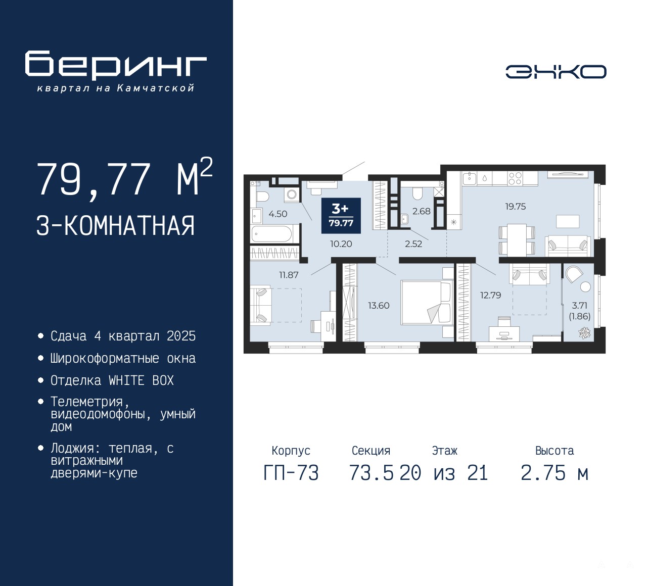 3-комн. квартира в ЖК "Беринг" на 20 этаже. Квартира без отделки, полностью готова к ремонту. Общая площадь: 79.77 кв.м., жилая: 38.26 кв.м., площадь просторной кухни-столовой: 19.75 кв.м. Угловая квартира, идеально подойдет любителям тишины и панорамных видов. В квартире одна лоджия, один совмещенный и один раздельный санузел. Высота потолков 2.75 м.