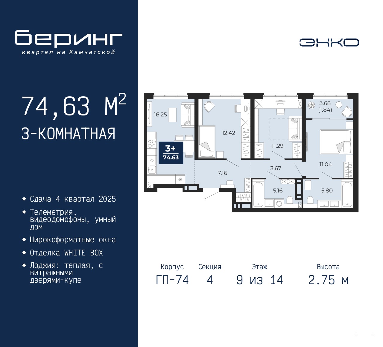 Трехкомнатная квартира от застройщика в ЖК "Беринг" на 9 этаже. Квартира без отделки, полностью готова к чистовой отделке и дальнейшему ремонту. Общая площадь: 74.63 кв.м., жилая: 34.75 кв.м., площадь просторной кухни-столовой: 16.25 кв.м. Комнаты изолированные, все окна выходят на одну сторону. В квартире одна лоджия, два совмещенных санузла. Высота потолков 2.75 м.