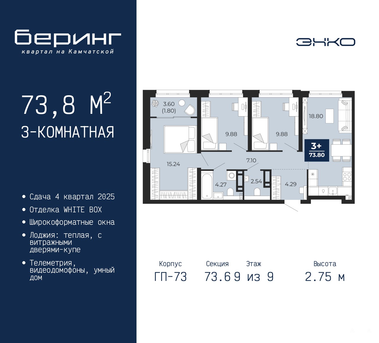 Трехкомнатная квартира в ЖК "Беринг" на 9 этаже. Квартира без отделки, после выдачи ключей можно делать ремонт. Общая площадь: 73.8 кв.м., жилая: 35 кв.м., площадь просторной кухни-столовой: 18.8 кв.м. Квартира угловая, очень светлая, естественная вентиляция при открытии окон. В квартире одна лоджия, один совмещенный и один раздельный санузел. Высота потолков 2.75 м.