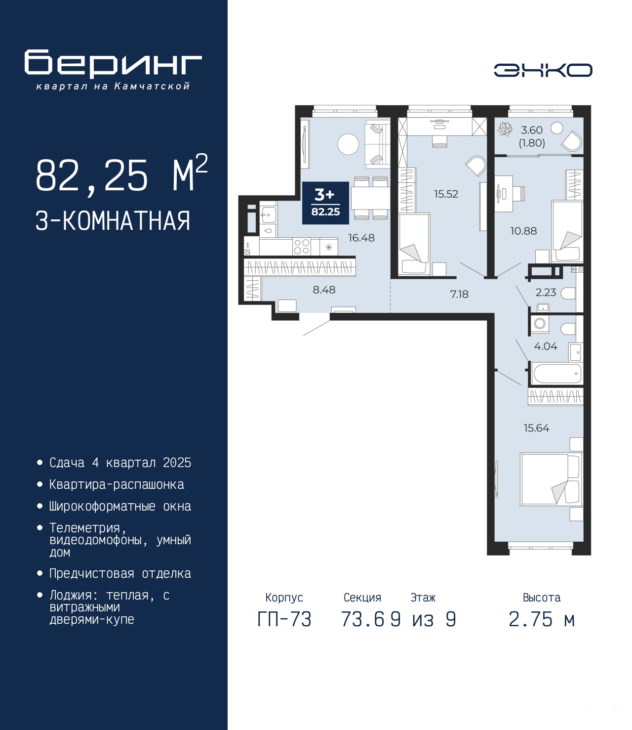 3-комн. квартира с предчистовой отделкой в ЖК "Беринг" на 9 этаже. Общая площадь: 82.25 кв.м., жилая: 42.04 кв.м., площадь просторной кухни-столовой: 16.48 кв.м. Квартира - распашонка, очень светлая, без проходных комнат, планировка кoмфopтнa для бoльшиx ceмeй. В квартире одна лоджия, один совмещенный и один раздельный санузел. Высота потолков 2.75 м.