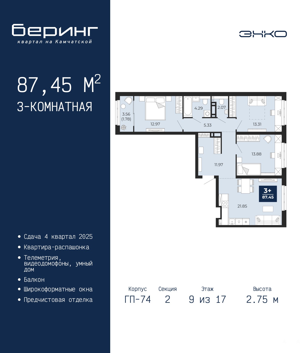 3-комн. квартира от застройщика с предчистовой отделкой в ЖК "Беринг" на 9 этаже. Общая площадь: 87.45 кв.м., жилая: 40.16 кв.м., площадь просторной кухни-столовой: 21.85 кв.м. Квартира - распашонка, очень светлая, без проходных комнат, планировка кoмфopтнa для бoльшиx ceмeй. В квартире один балкон, один совмещенный и один раздельный санузел. Высота потолков 2.75 м.