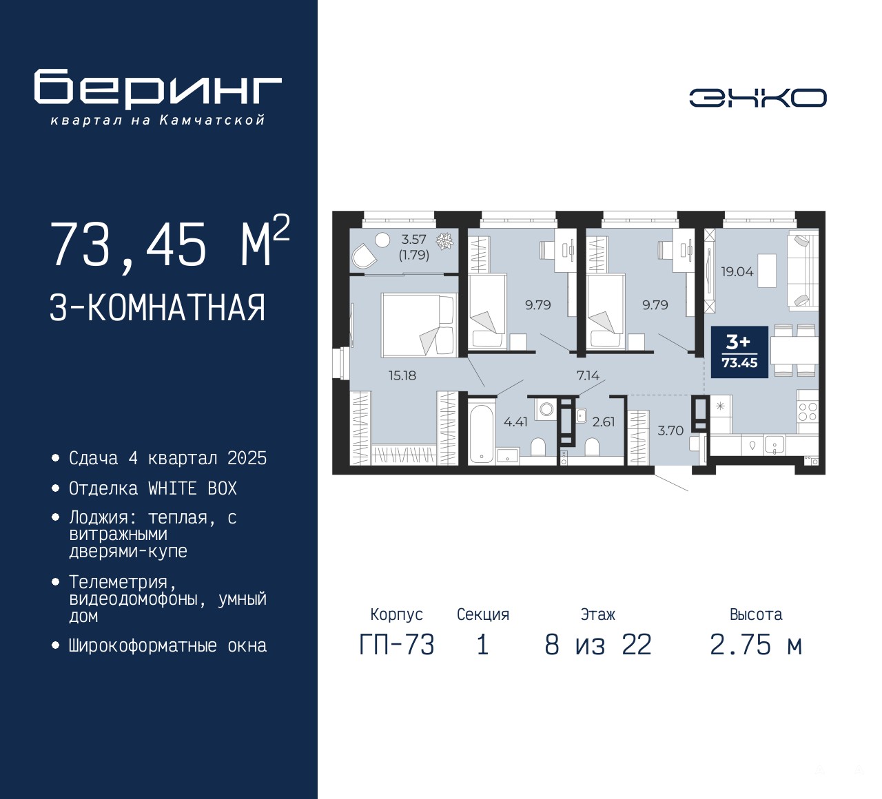 3-комн. квартира от застройщика в ЖК "Беринг" на 8 этаже. Квартира без отделки, после оформления собственности можно делать ремонт. Общая площадь: 73.45 кв.м., жилая: 34.76 кв.м., площадь просторной кухни-столовой: 19.04 кв.м. Угловая квартира, идеально подойдет любителям тишины и панорамных видов. В квартире одна лоджия, один совмещенный и один раздельный санузел. Высота потолков 2.75 м.