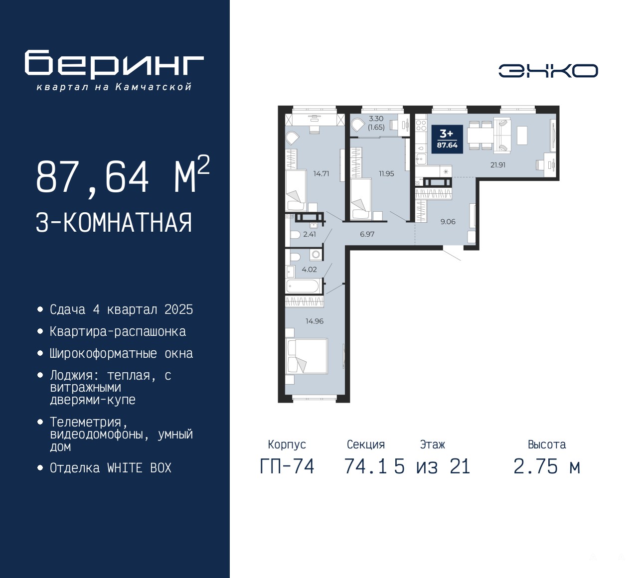 Просторная 3-комн. квартира в ЖК "Беринг" на 5 этаже. Квартира без отделки, новый собственник может сделать ремонт по индивидуальному дизайн-проекту. Общая площадь: 87.64 кв.м., жилая: 41.62 кв.м., площадь просторной кухни-столовой: 21.91 кв.м. Квартира - распашонка, без проходных комнат, окна выходят на paзные стороны дома. В квартире одна лоджия, один совмещенный и один раздельный санузел. Высота потолков 2.75 м.