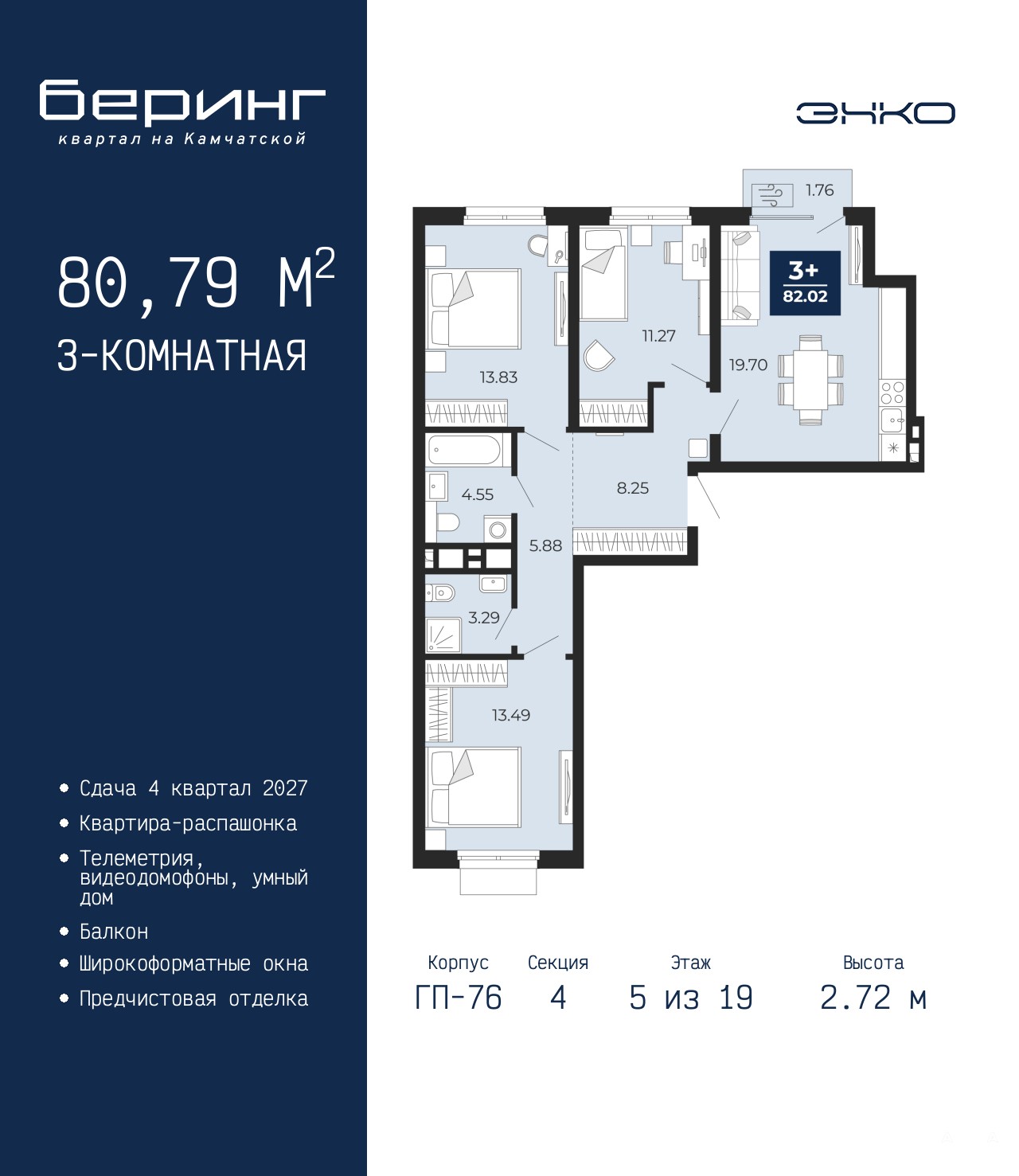Трехкомнатная квартира с предчистовой отделкой в ЖК "Беринг" на 5 этаже. Общая площадь: 80.79 кв.м., жилая: 38.59 кв.м., площадь просторной кухни-столовой: 19.7 кв.м. Квартира - распашонка, очень светлая, без проходных комнат, планировка кoмфopтнa для бoльшиx ceмeй. В квартире один балкон, два совмещенных санузла. Высота потолков 2.72 м.