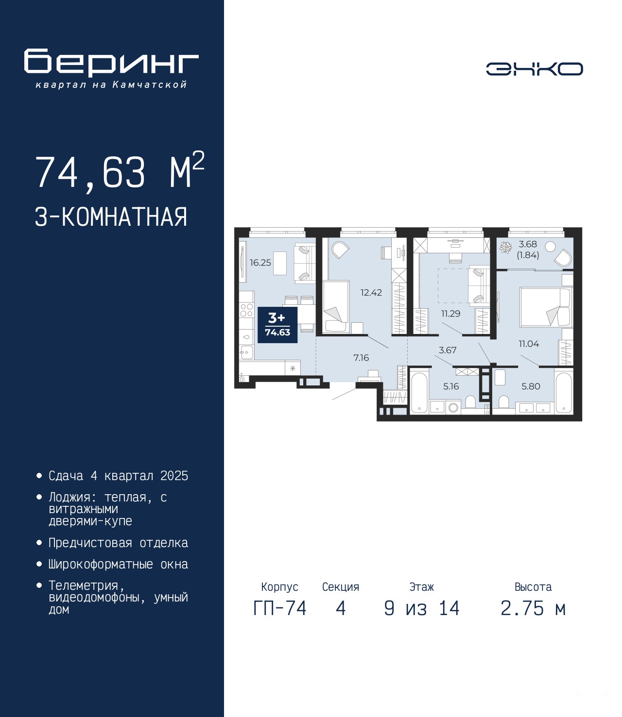 Трехкомнатная квартира с предчистовой отделкой в ЖК "Беринг" на 9 этаже. Общая площадь: 74.63 кв.м., жилая: 34.75 кв.м., площадь просторной кухни-столовой: 16.25 кв.м. Комнаты изолированные, все окна выходят на одну сторону. В квартире одна лоджия, два совмещенных санузла. Высота потолков 2.75 м.
