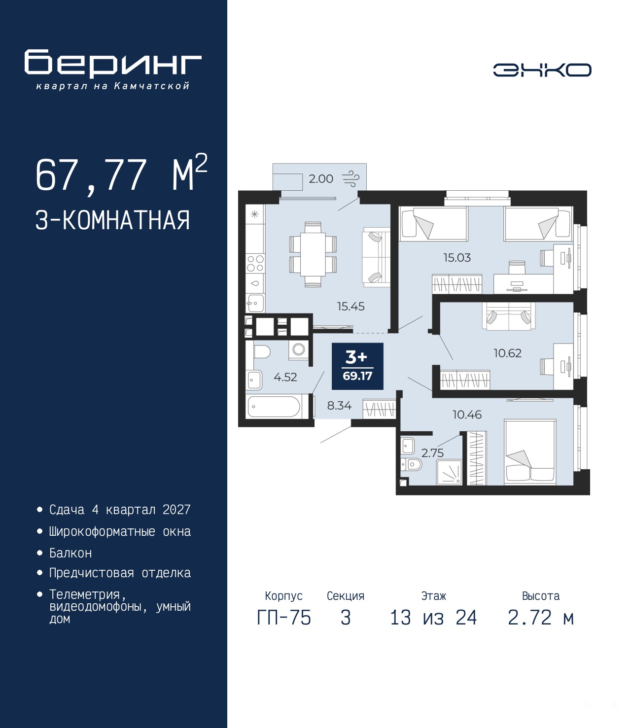 Продается 3-комн. квартира с предчистовой отделкой в ЖК "Беринг" на 13 этаже. Общая площадь: 67.77 кв.м., жилая: 36.11 кв.м., площадь просторной кухни-столовой: 15.45 кв.м. Квартира угловая, идеально подойдет любителям тишины и панорамных видов. В квартире один балкон, два совмещенных санузла. Высота потолков 2.72 м.