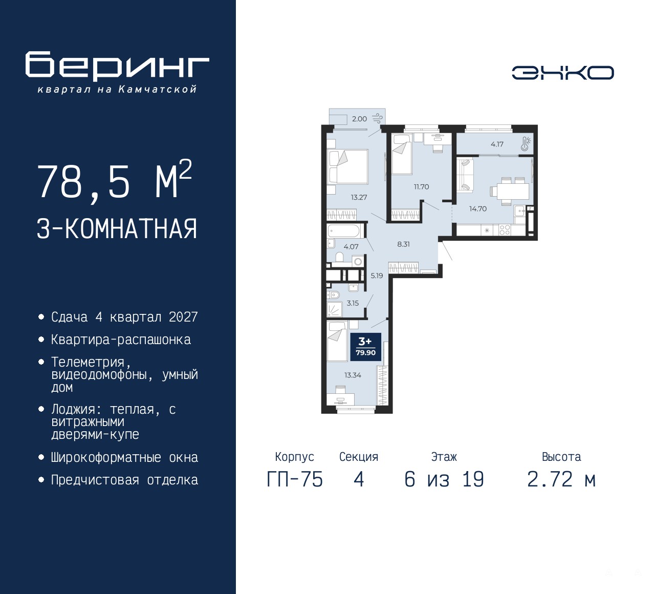 Трехкомнатная квартира от застройщика с предчистовой отделкой в ЖК "Беринг" на 6 этаже. Общая площадь: 78.5 кв.м., жилая: 38.31 кв.м., площадь просторной кухни-столовой: 14.7 кв.м. Квартира - распашонка, без проходных комнат, окна выходят на paзные стороны дома. В квартире один балкон и одна лоджия, два совмещенных санузла. Высота потолков 2.72 м.