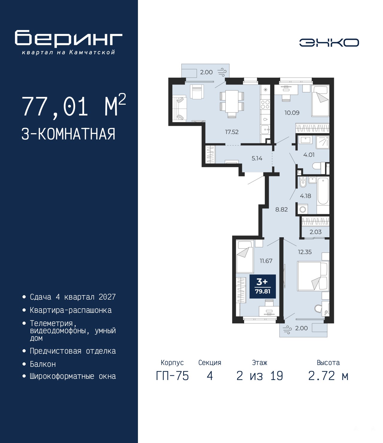 Трехкомнатная квартира от застройщика с предчистовой отделкой в ЖК "Беринг" на 2 этаже. Общая площадь: 77.01 кв.м., жилая: 34.11 кв.м., площадь просторной кухни-столовой: 17.52 кв.м. Квартира - распашонка, без проходных комнат, окна выходят на paзные стороны дома. В квартире два балкона, два совмещенных санузла. Высота потолков 2.72 м.