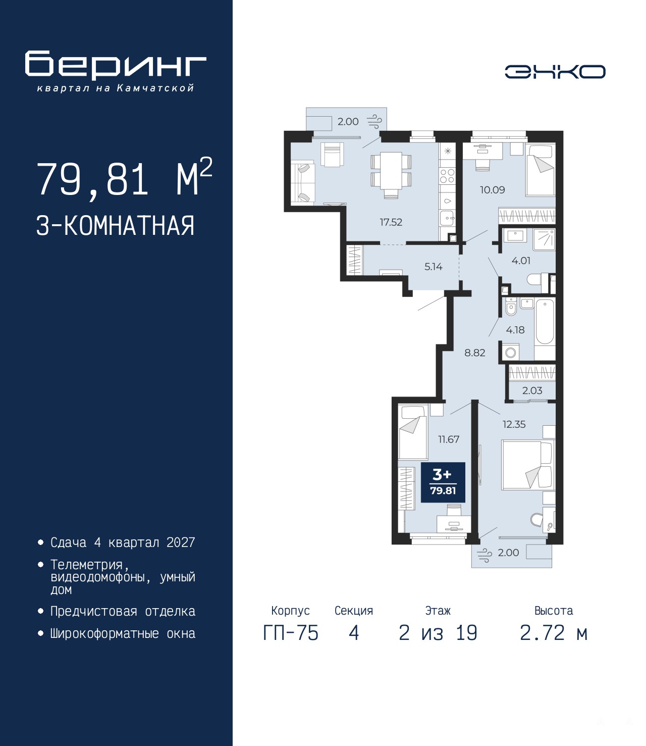 3-комн. квартира с предчистовой отделкой в ЖК "Беринг" на 2 этаже. Общая площадь: 79.81 кв.м. Высота потолков 2.72 м.