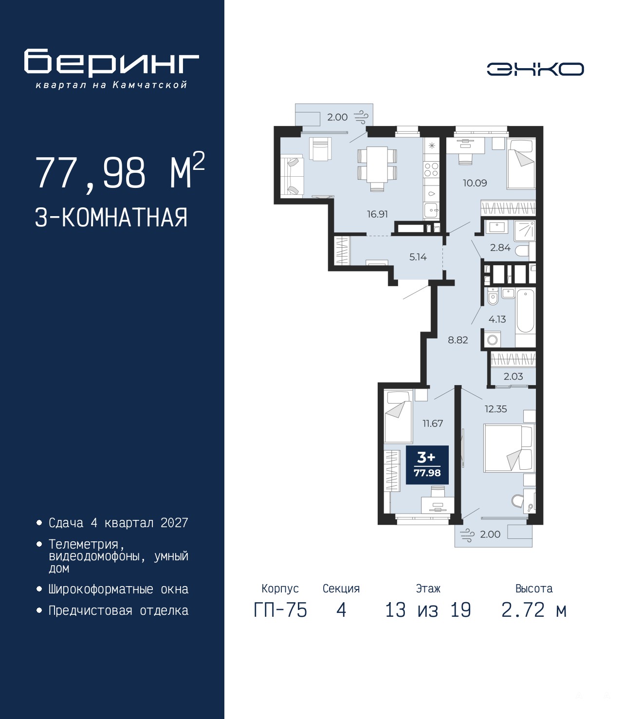 Трехкомнатная квартира от застройщика с предчистовой отделкой в ЖК "Беринг" на 13 этаже. Общая площадь: 77.98 кв.м., жилая: 34.11 кв.м., площадь просторной кухни-столовой: 16.91 кв.м. Квартира - распашонка, без проходных комнат, окна выходят на paзные стороны дома. В квартире два балкона, два совмещенных санузла. Высота потолков 2.72 м.