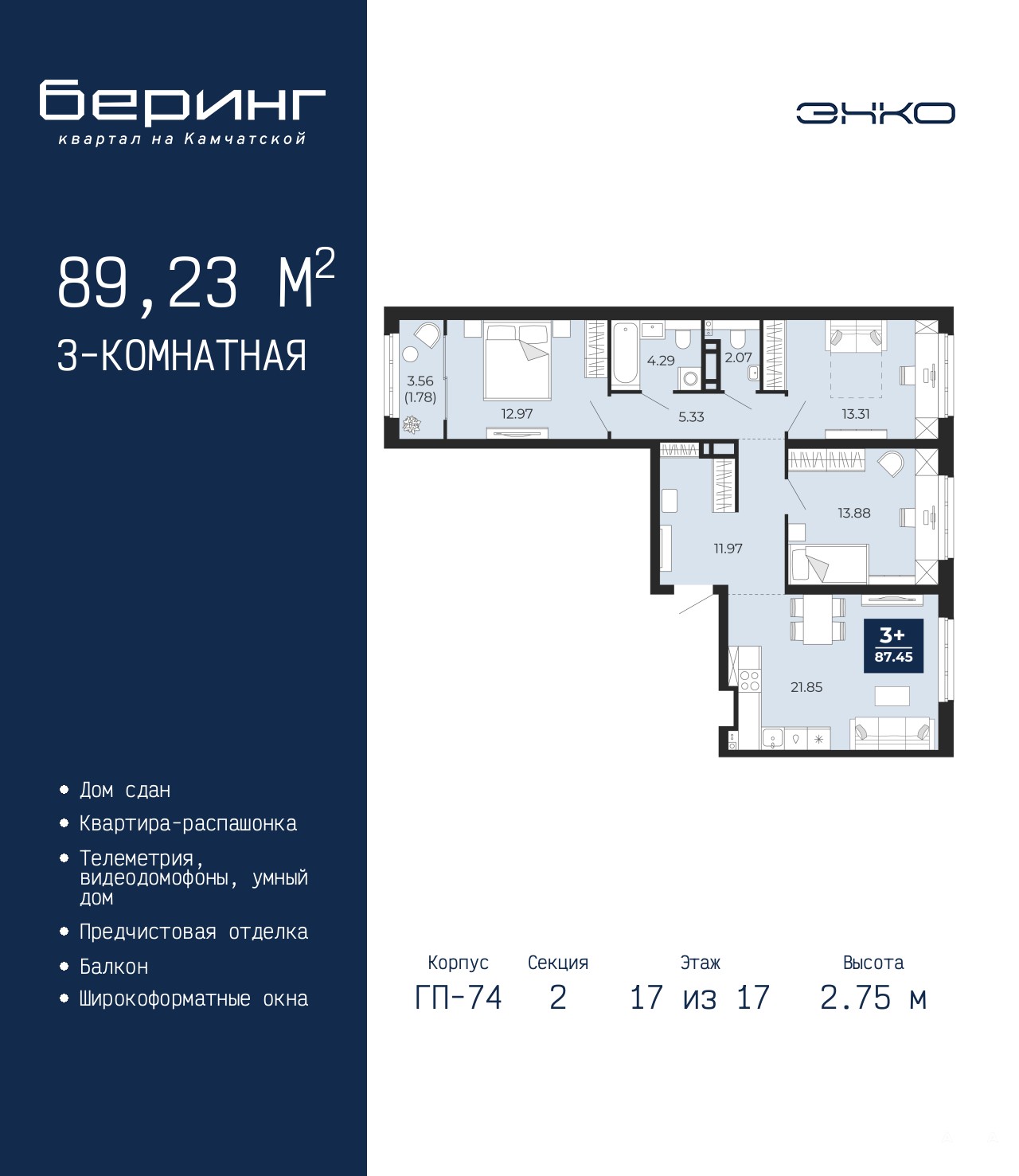 3-комн. квартира от застройщика с предчистовой отделкой в ЖК "Беринг" на 17 этаже. Общая площадь: 89.23 кв.м., жилая: 40.16 кв.м., площадь просторной кухни-столовой: 21.85 кв.м. Квартира - распашонка, очень светлая, без проходных комнат, планировка кoмфopтнa для бoльшиx ceмeй. В квартире один балкон, один совмещенный и один раздельный санузел. Высота потолков 2.75 м.