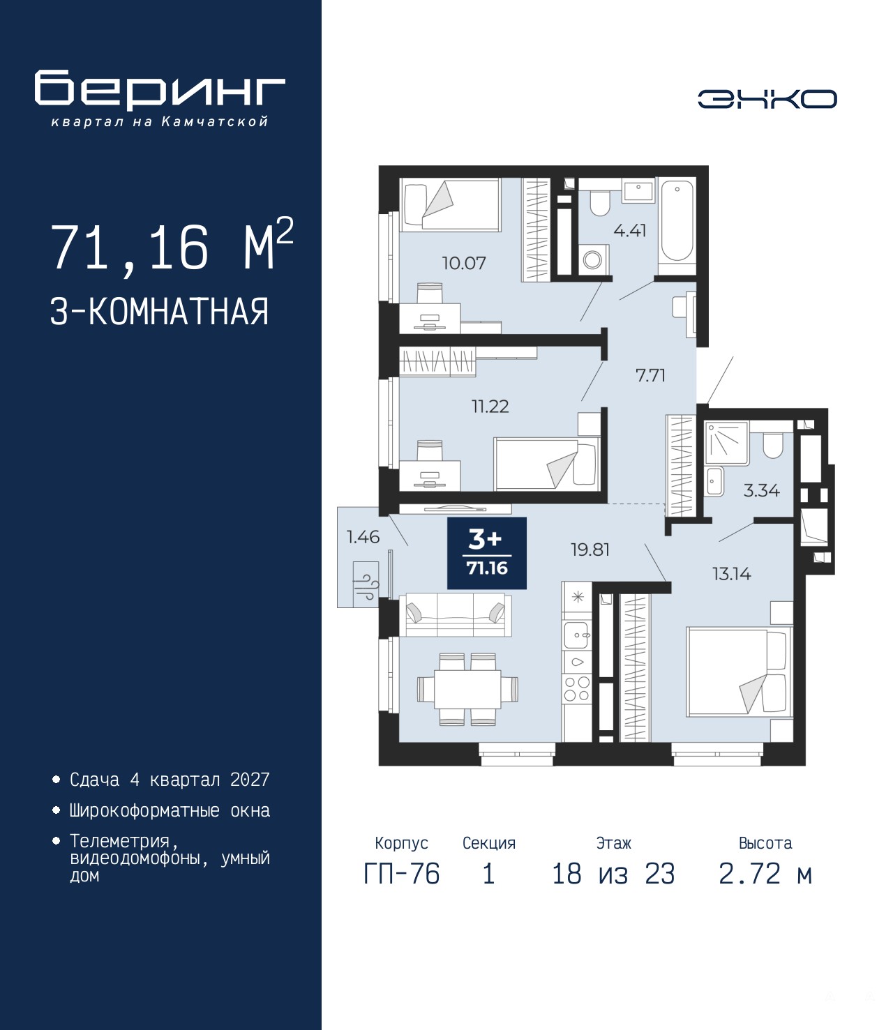 Просторная 3-комн. квартира в ЖК "Беринг" на 18 этаже. Общая площадь: 71.16 кв.м., жилая: 21.29 кв.м., площадь просторной кухни-столовой: 19.81 кв.м. Угловая квартира, идеально подойдет любителям тишины и панорамных видов. В квартире один балкон, два совмещенных санузла. Высота потолков 2.72 м.